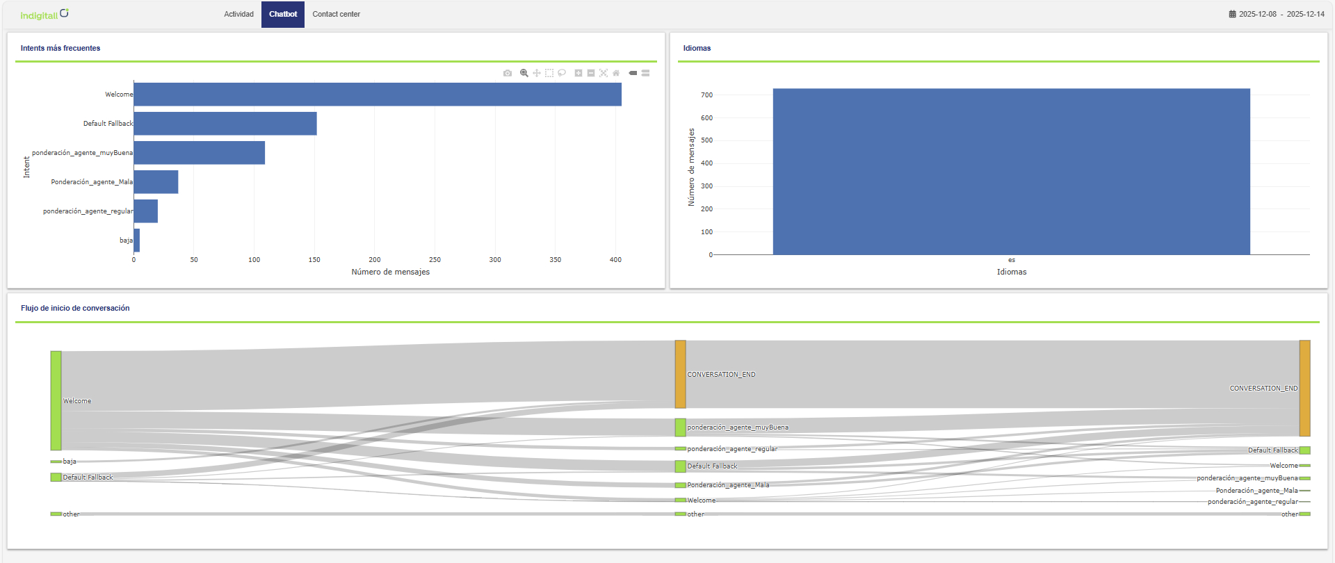 - Most Frequent Intents: A ranking of the most common user intentions/topics detected by the bot.