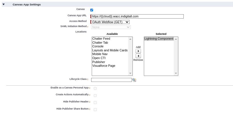 - Canvas App URL: with the URL that receives the POST request to authenticate the Salesforce call: