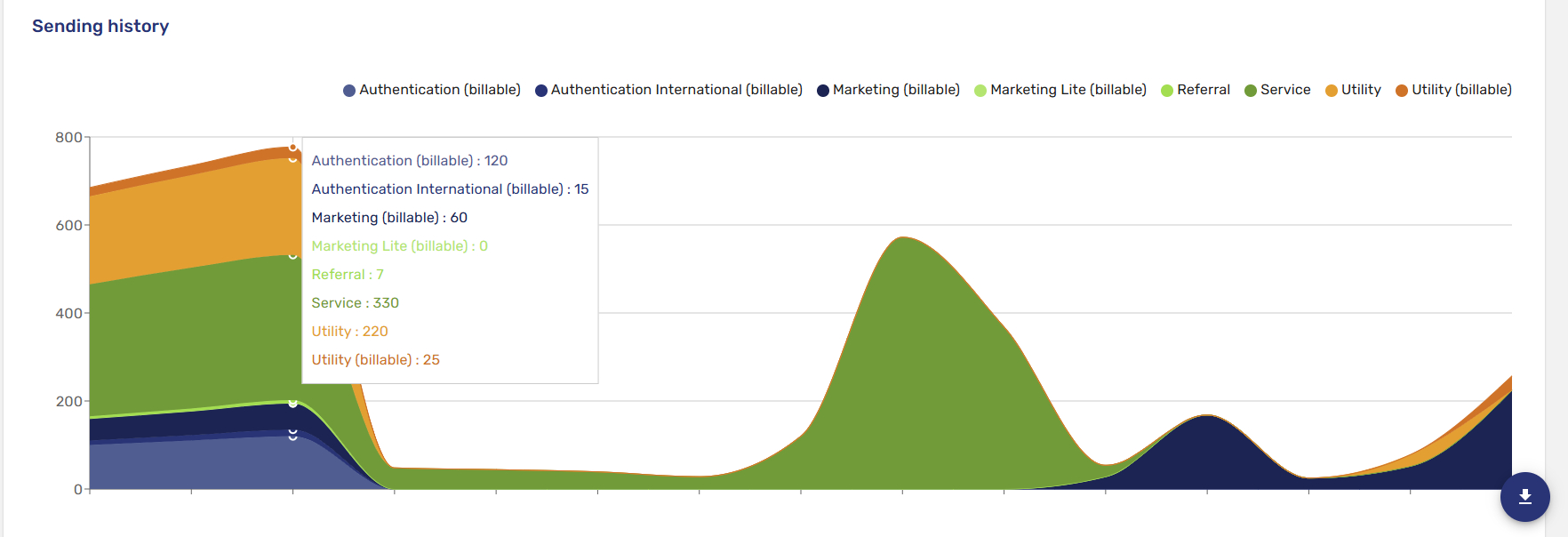 This stacked area chart provides a chronological view of your message volume. You can hover over any point on the timeline to see a detailed breakdown of message categories, such as Marketing, Service, or Utility, for that specific date.