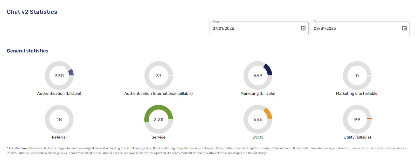 The Chat Statistics section provides a visual and data-driven overview of your campaign performance and channel usage. This dashboard is essential for monitoring engagement levels and understanding billing categories.