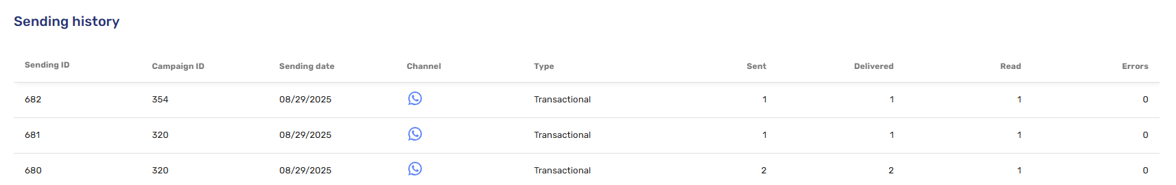 - Metrics: Tracks the exact number of messages Sent, Delivered, and Read, while flagging any Errors for immediate troubleshooting.