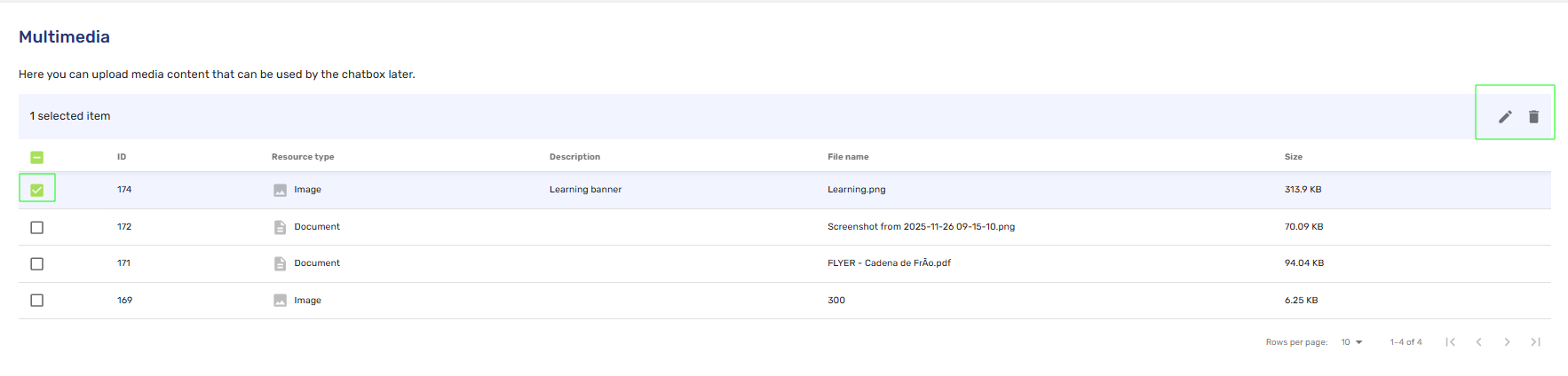 - Centralized Library: The main dashboard displays all stored assets, including their ID, Resource type, Description, File name and Size.