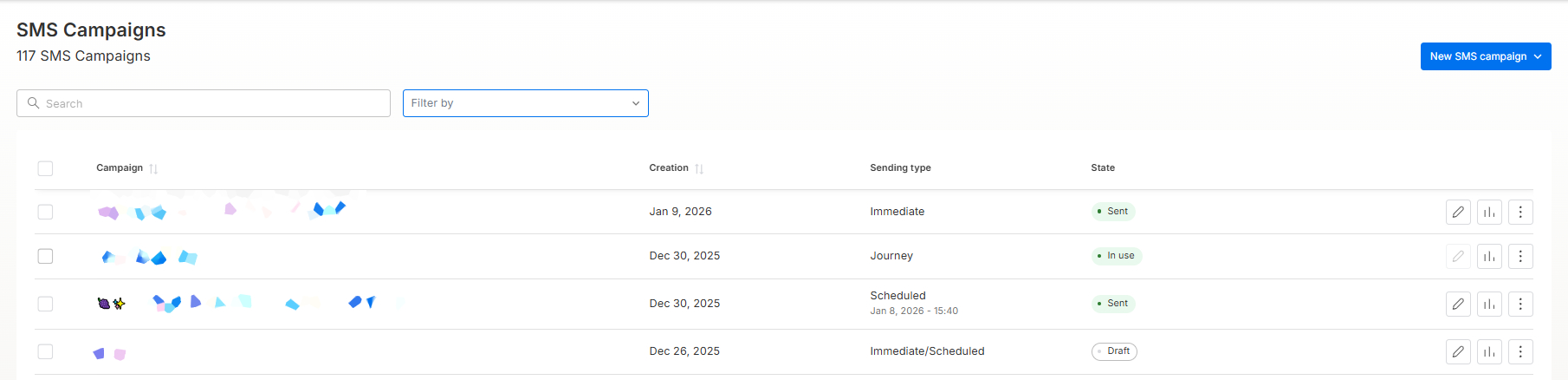 - Creation: The date the campaign was created. Use the arrow icons to sort chronologically (from newest to oldest or vice versa).