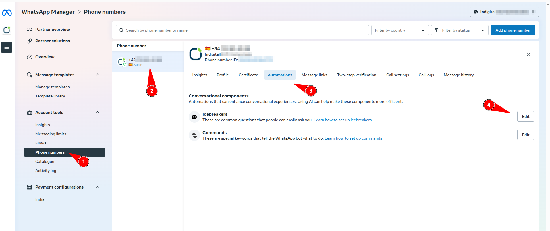 To configure Icebreakers at the phone number level, please access your WhatsApp Business Manager following the steps highlighted in the image:
