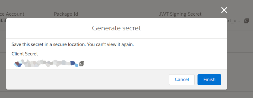 This is the only time the secret will be visible. Once you click "Finish" or close the pop-up, you will never be able to view it again.